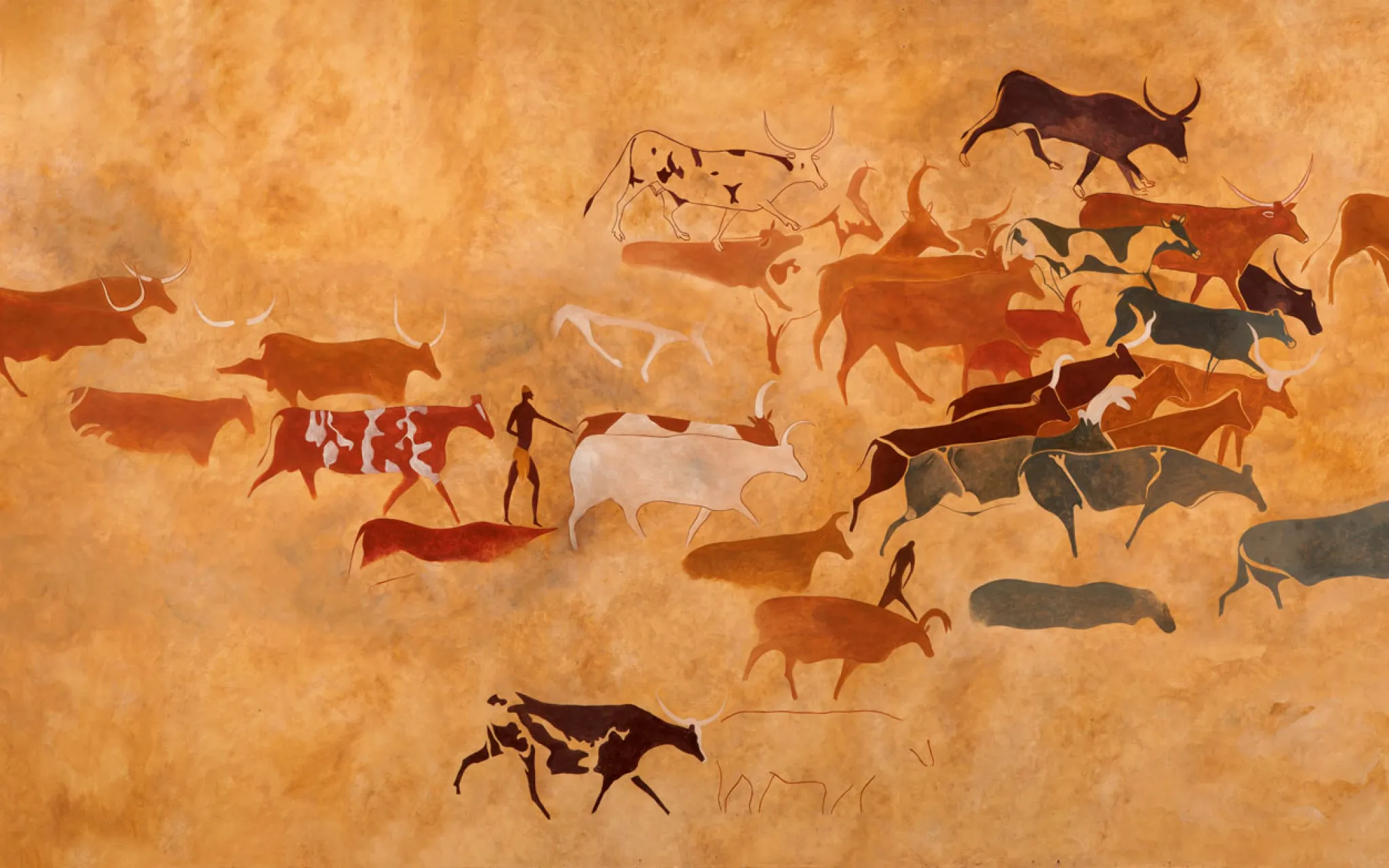 Ce relevé, particulièrement précieux en ce qu’il restitue une polychromie unique dans le Tassili, montre un troupeau de bœufs surveillé par ses gardiens, ainsi qu’en haut, à gauche, un des gardiens procédant au découpage d’une des bêtes.